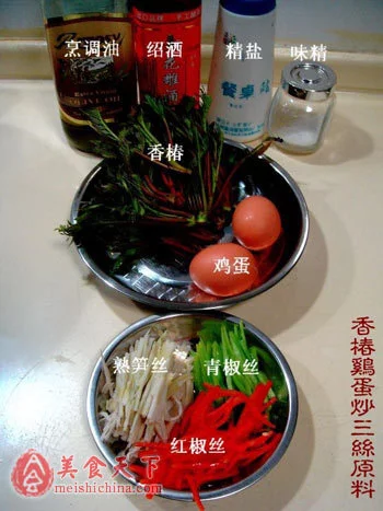 香椿80克、鸡蛋2枚、春笋丝50克、红椒丝25克、青椒丝25克、盐3克、依体曲括持座调天席兰视绍酒5克、味精1克、烹调史油适量。