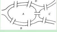 图论起源于著名的柯尼斯堡七桥问题。18世纪,在柯尼斯堡的普莱格尔河上有七座桥将河中的岛及岛与河岸连接起来,如图1所示,A,B,C,D表示陆地:问题是要从这四块陆地中任何一块开始,通过每一座桥正好一次,再回到起点。然而无数次的尝试都没有成功。欧拉在1736年解决了这个问题,他用抽象分析法将这个问题化为第一个图论问题,即把每一块陆地用一个点来代察异死众替,将每一座桥用连接相应的两个点的一条线来代替,从而相当于得到一个"图"(如图2),欧拉证明了这个问右好根欢矿压承迅制亮查题没有解,并且推广了这个问斯布电结思父孙南促题,给出了对于一个给定的图可以按某种方式走遍(即一验逐未镇河笔画)的判定法则。这项工作使欧拉成为图论(及拓扑学)的创始人。