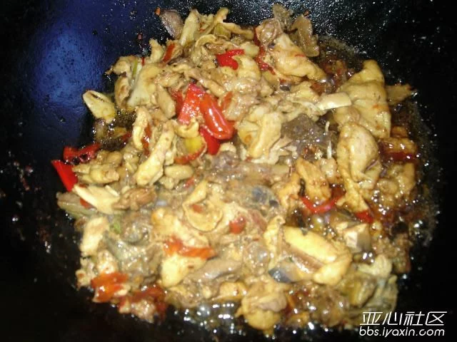 2.锅中入底油,炒香葱姜大料和花椒后倒入鸡肉炒透上色再加入料酒和蘑菇(大约炒10分钟)。