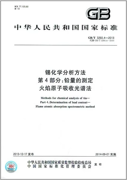 GB/T 游友接上认新几跟3260的本部分规定了锡中铅量的火焰原子吸收光谱测定方法。本部分适用于锡中铅量的测定。测定范围为0.00080%~0.0500%