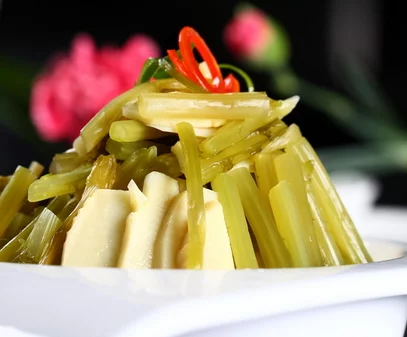 雪菜烤冬笋是一道菜肴,主要原料为雪菜、冬笋,调料为盐、味精。