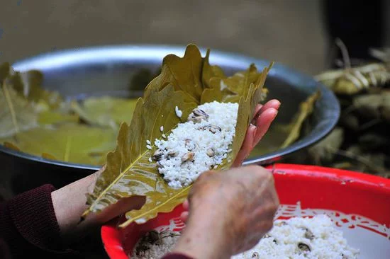 来"槲叶",用水一煮,再用清水洗净,就可包粽子,用"槲叶"包的粽子别一番山林的清香。也有在粽子里放豆子和红枣的。煮粽子的锅里一定要煮些鸡蛋,最好是些咸鸡蛋,据说吃了粽子锅里煮的鸡蛋,来自夏天不生疮,不头痛。当地人认为吃熟蒜瓣有去体内百毒之效。