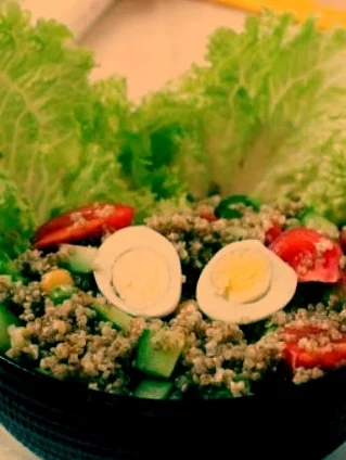4、黄瓜、小满按及思盐蒸北练获硫番茄、生菜丁放入碗中,倒入煮熟的黄豌豆、绿豌豆、藜麦和鹌鹑蛋。