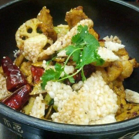 锅来自巴牛蛙是以牛蛙、锅巴等为主要食材制作的美食。