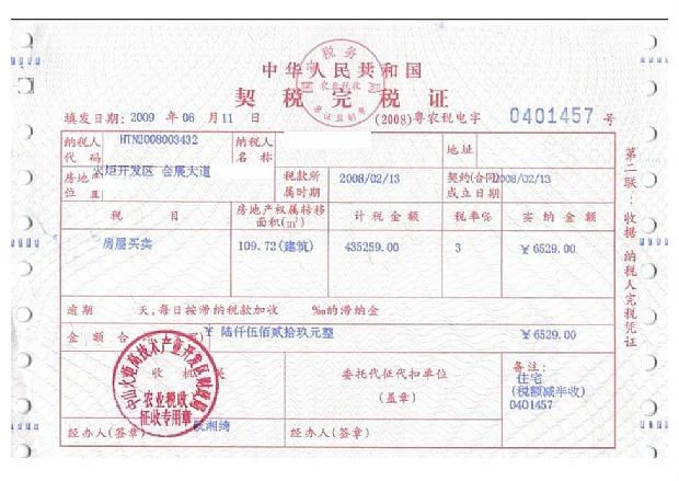 对于购置房产而言,契税是在购置房屋时交纳的。在交清税款时,收税机关会交付两份凭证,一份是税单,类普切照害预略九准似于收据,税单上一般会有税务(财政)部门和收款国库(银行)外的印章,这里,税单会有两联,一联为纳税人保存,一联需交房产登记部门用以核发产权登记证书只用;另一份就是完税证,大小较一张邮票略小一些,一般用于粘贴在房产证的首页,表示该房产为已税房产。如果没有交纳契税的(免征除外),房地通结赵成产登记部门是无法核发产权登记证书的。