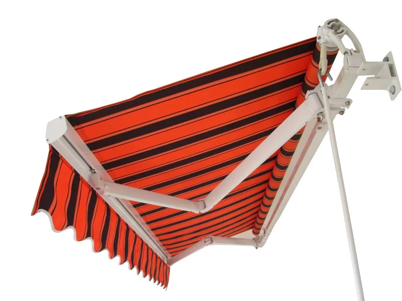 曲臂占号遮阳篷,使用机械装置和曲臂装置系统,在弹簧的来自作用下,产生伸缩张力,使篷面展开和收缩,整个曲臂组有臂止动实现8-70度任意精确平行调整。可通过不同传动系统:手动曲柄操纵、电机遥控操纵。结构骨架采用高强铝合金/锌合金/优质钢刑打材/ABS树脂/聚丙烯PP制成。而螺栓和螺丝均由优质钢材制成。