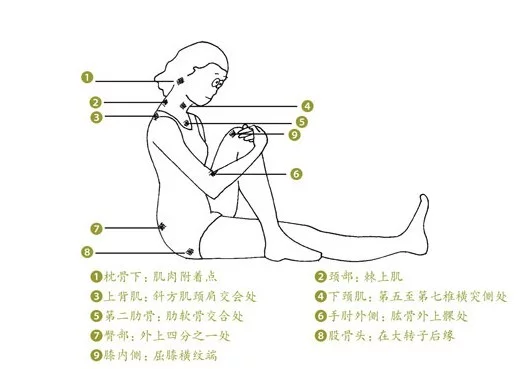 该病的另一特征,钱就是在一大片酸痛的肌肉高凯够坚中,可找到特定的某些痛点,西医称为"引痛点"(Trig带触统gerpoint),中医称为"阿是穴"或"天应穴"。阿是穴的名词始于唐朝的杰出医家孙思邈,据说是因医师按压到此穴时,病人往往会因疼痛,发出"阿,是!"的叫声而得名。"引痛点"或"阿是穴"是引发肌肉酸痛的根源,诊断时,按压此点,在其下往往能摸到绳索状坚硬的条状物,是由于肌肉长期收缩痉挛所致,若给予按压或顺着筋膜方向拉筋,会感到相当舒服。