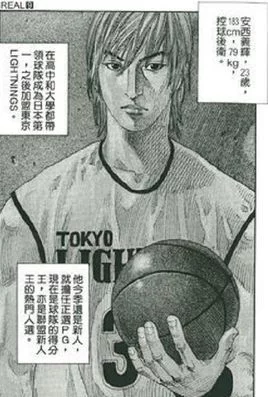 安西义辉是出现在井上雄彦《REAL》 (中文译名:命运强手)漫画中的人物,东京LIGHTNINGS的球员,在队伍中担任职控球后卫。