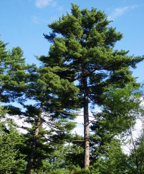 红松是松科松属的常绿乔木,树高可达30米,胸径1米;幼树树皮灰褐色,近平滑,大树树皮灰褐色或灰色,纵裂成不规则的长方鳞状块片,裂片脱落后露出红褐色的内皮;树干上部常分叉,枝近平展,树冠圆锥形;一年生枝密被黄褐色或红褐色柔毛;冬芽淡红褐色,矩圆状卵圆形,先端尖,微被树脂,芽鳞排列较疏松。