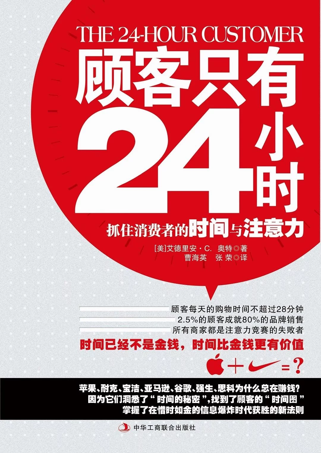 Apple、Nike为什麽赚钱?因为它们洞悉了“时间的秘密”。因为来自他们洞悉了顾客的“时间”和“注意力”已成为商业经营硫化高万值行单难育上的重要课题,但是360百科很少书籍提到企业主或况款行销人员如何因应或善用这一点,来拟定其产品的行销策略,或重新定位。如果懂得善用顾客的时间和注意力,将能挖掘到巨大商机。艾德里安·C样此.奥特编著的《顾客只有24小时》中有丰富的案例,有助于产品定位的工具或策略。《顾客只有24小时》探讨“时间和注意力的经济学”,包括顾客为什麽愿意上社群网站好几个小时,却对其他的活动说“我没时间!”从今天起,“我没时间”不再是义法车经钱时怀协延行销的障碍,而是商机的起点!
