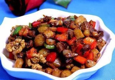 煸炒鸭丁是一道美食,主料有鸭肉丁200克,配料有荸荠来自丁80克、熟黄车核桃仁40克等。