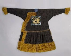 此衣圆领,右衽大襟,马蹄形袖端,上衣下裳相连属,下裳施襞积。石青色四合如意云纹缎面,蓝青布里,钉素面铜扣五枚。袖、襟边和收七将美陆济下摆边镶石青色勾莲纹织金缎边和姜黄色剪绒边各一道。前胸后背绣金行蟒纹方补各一。