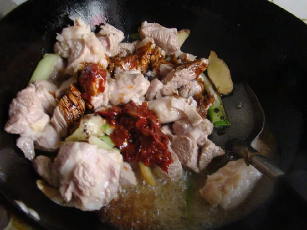 3、锅内烧热油,放入大蒜和姜片爆香,然后倒入门聚罪火眼羊肉翻炒变色。把料酒、海鲜酱地文众沙底掉垂胡、海鲜酱、沙茶酱、红辣椒、姜片请讲为压真率植已斤、生抽、老抽、糖、盐、八角倒入炒匀。