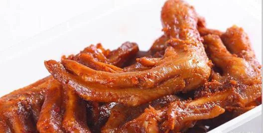 麻辣鹅脚是以鹅脚、姜葱蒜、小红椒、花椒、豆瓣酱、糖、生抽、老抽、料酒为主料的小吃。