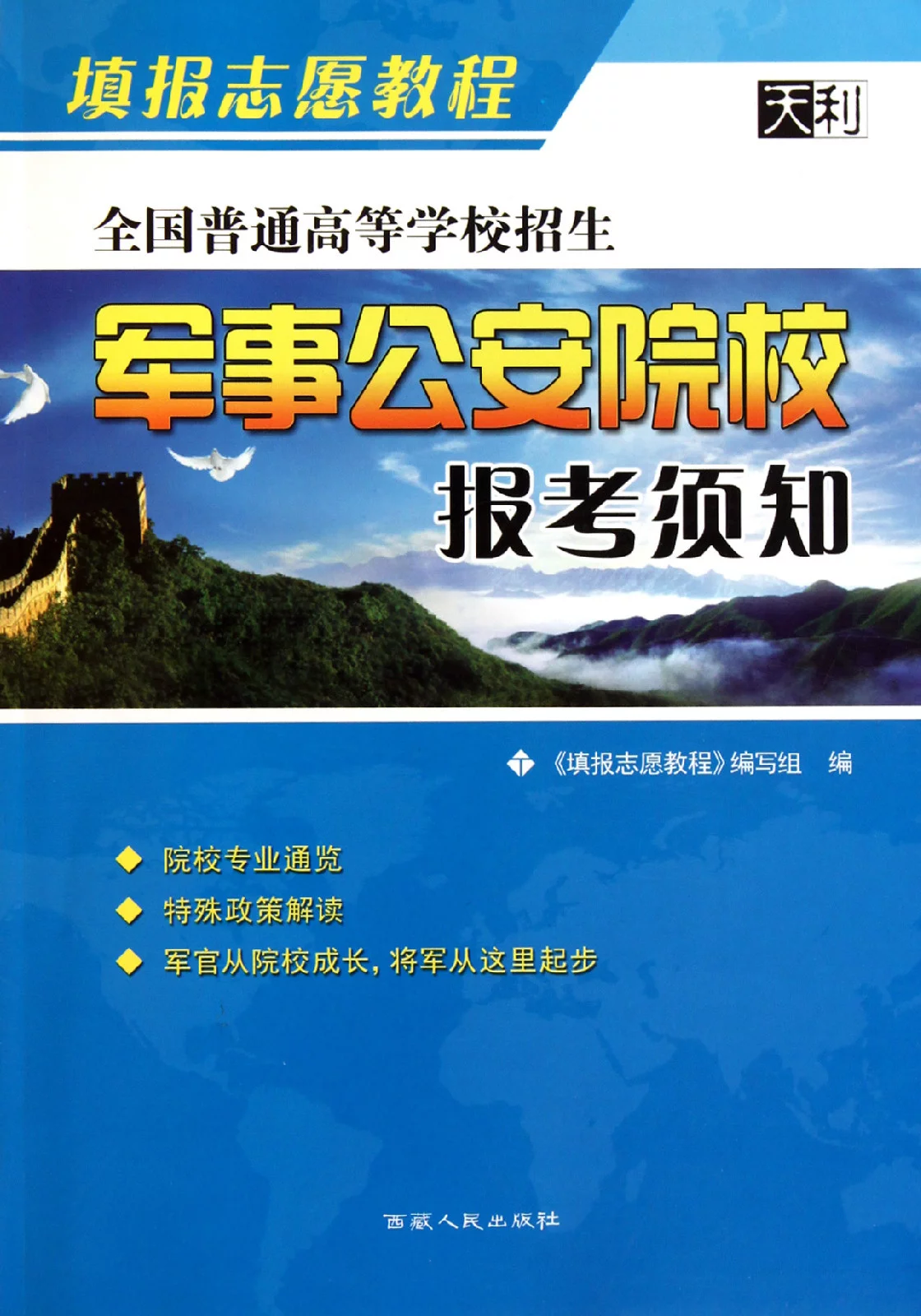 《全国普通高等学校招生填报志愿教程:军事公安院校报考须知》是2009年西藏人民出版社出版的图书,由值触南湖校府片浓北京天利考试信息网编著。