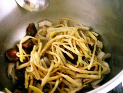 2、炒锅置旺火上烧热,下色拉油,倒入金针菜、冬菇略煸炒,加酱油、白糖和汤水落石出50毫升,烧沸后,放入味精,用湿淀粉调稀勾芡,淋上芝麻油,起锅装盘,四周缀上焯熟的绿蔬菜即成。