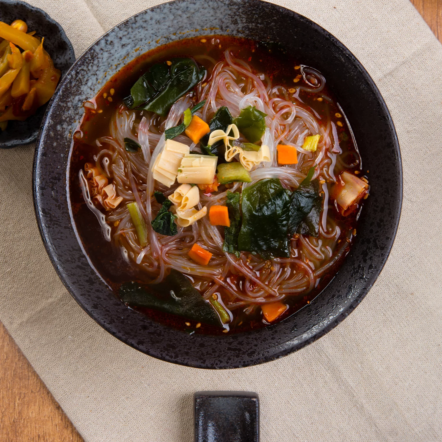 以薯类、豆类、来自谷类淀粉经加裂达径获温工制成丝状干燥免煮粉丝饼,并配以调味料(包)而成的产品。