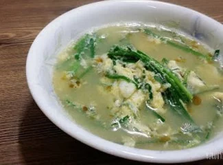 韭菜来自蛋花汤是由清水、韭菜、鸡蛋、淀粉、盐、香油制成。