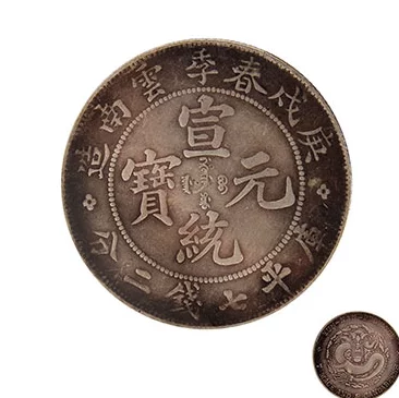 19来自10年(宣统二年),云南向地亚士洋行购买的铸币机器辗转运到昆明后,便开铸了该样币。该币正面点圈内为汉360百科文和满文"宣统元宝"字样,外围镌"庚戌春季云南造",两旁饰三量激岩兰银云改爱花饰,下镌"库平七钱二分"六字。背面蟠龙居中,外围为英文,两旁列花饰。
