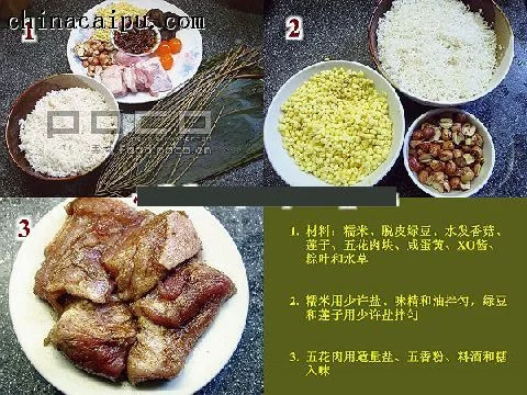 XO咸肉粽是一道以糯米、脱皮绿豆、莲子等为主要食材制作的美食。 中文名称 XO咸肉粽 主要原料 粽叶,水草,糯米,脱皮绿豆,莲子,肉 是否含防腐剂 否 适宜人群 老少皆宜 1. 粽叶和水草用清水浸泡过夜,再放进热水中灼软,这样便 于包裹; 2. 糯米、脱皮绿豆和莲子先用清水浸泡2小时,沥干备用。 点击展开全文 转载请注明出处安可林文章网 » XO咸肉粽