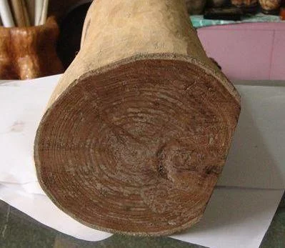 心材颜色白髓部分向外同栗棕色向黄棕色逐渐变淡,有时带紫红色,具深咖啡色带状纹。