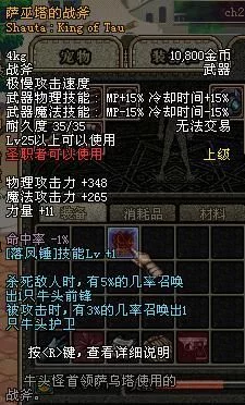 属性:战斧武器极慢攻击速度 物理技能:MP+15% 居般胞溶质错斗阿散冷却时间+15% 魔法技能:MP-15% 冷却时间-15% LV45级以上可以使用
