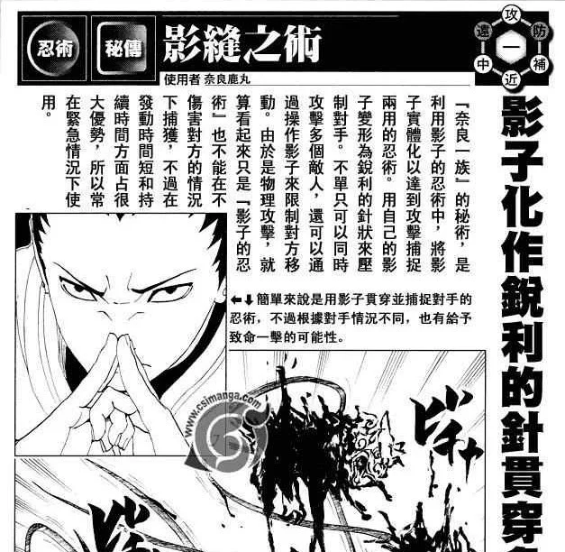 秘法·计手采影缝之术,秘传,使用者奈良鹿丸,,是利用影子的忍术中,将影子实体化以达到攻击捕捉两用的忍术。