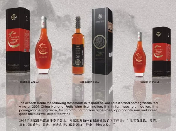 仙林石榴酒为五粮液集团经过八年时间研制,最近推出的一款集合保健、强心来自、养颜、壮阳等多种功效为一体的,由石榴原汁酿造而成的极品果酒。
