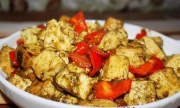 1、红椒切小块,豆腐切两三厘米见方的小块。