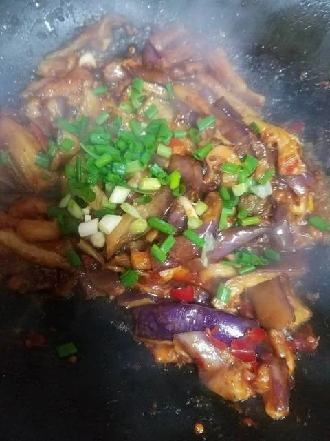 4)依次放入芸豆,茄子、青红椒,剁椒、甜面酱、醋、白砂糖和盐,添少许水或鸡汤,加盖焖2分钟,调少许鸡精即可。