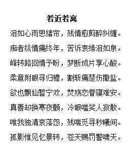 《若近若离》是写的网络小说连载于。 中文名 若近若离 内容 泪如心雨思绪帘等 评价 语句优美 特点 句式工整 泪医如心雨思绪帘,残情愈来自剪醉纠缠。 痴者纵情痛终年,苦诉衷缘泪如泉。 峰转路回情予盼,梦断字道望顾裂成片享心酸。 柔意附眼寻归檐,割斩痛楚伤撒盐。 欲也飘仙暂宁欢,焚殇恋眷寝难安。 真善却换寒夜颤,冷眼嗤笑人寂散。 唯我独清哀落怨,残喘觅寻秒曦间。 孤影惟见忆景转,苍天赐罚警啸天。 点击展开全文 转载请注明出处安可林文章网 » 若近若离