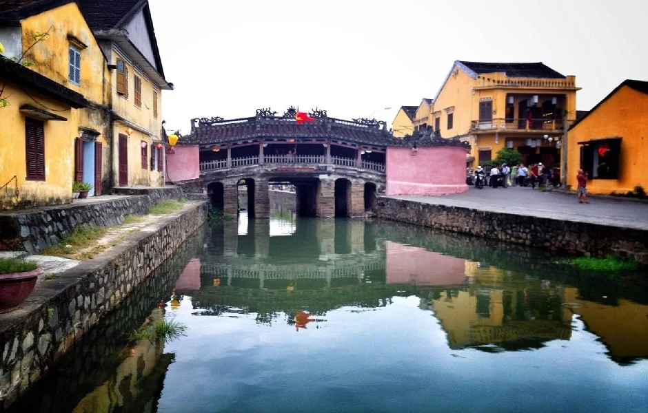日本廊桥建于1593年,最初由日本人修建,在中国明来自朝时由中国人重建并立碑为证。木头的红漆已经脱落, 和众多的中国古桥差不多。有意思的是桥上一端由猴子看守,一端由狗看守,越南也有12生肖,但和中国略有不同。