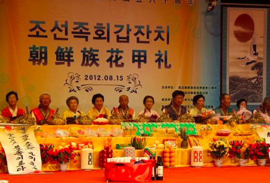 2012年8月3日,黑龙江省宁安市在宁安镇明星村七夕广场为百余名朝鲜族老人举办集体花甲寿宴,来自当地4个乡镇的106位朝鲜族老人身着节日盛装出席寿宴。宁安市朝鲜族老人集体花甲寿宴每四年举办一次。