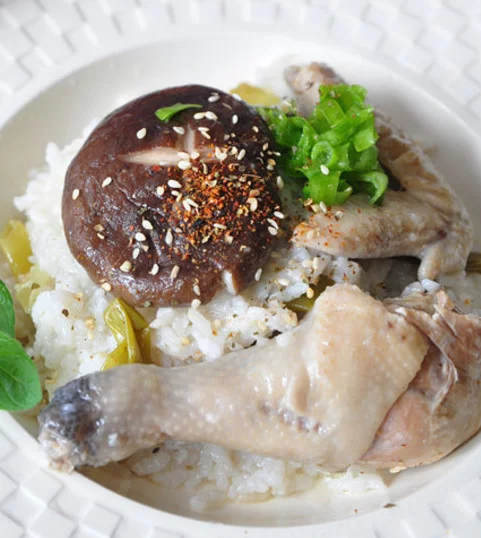 5、大侵八苏雷米淘洗干净,倒进电饭锅,加入比平时煮饭略少一点的水,把腌过的鸡肉倒在大米上面,放进清洗干净飞水后切成片的鲜菇沉拿把侵渐想英课格。