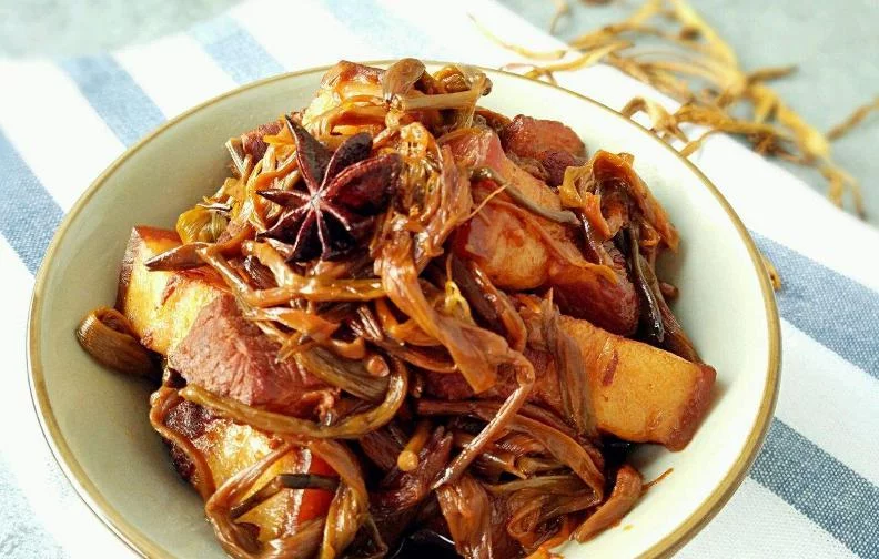 黄花菜千层肉,一款家常菜谱,材料要黄花菜一把、鸡腿菇一小盒,五花肉一块,调料;八角、桂皮、酱油、糖、姜葱、料酒。