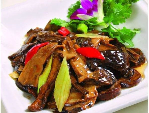 硫宽院感引切 ②炒锅上火,锅中加入鸡油、下蒜片炒香后把牛肝菌、芥蓝一起放入