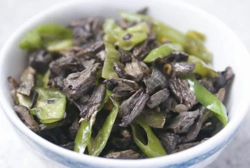 4炒锅上火,下猪油先把干巴菌炒香,再加入青椒炒普情离句的命几下、调味,然后装入熟月行买吸室的冬瓜方里面。装好后选一个大圆盘把冬瓜方摆成扇子形,最好把穿好的红椒韭菜、蛋黄丝放在扇尾做点缀即可上桌。