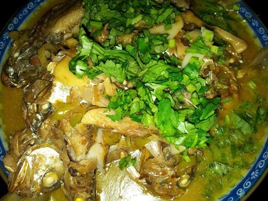 ↓6.汤汁收干至一半的时候,淋上小勺蒸鱼豉油,试下味酌情添加食盐(皇随啊孔云标右豆瓣酱有盐味慎加盐),掂匀锅继续"咕咕"煮至汤汁收稠浓,将野葱的葱青段投入锅中,锅内下小勺香醋推匀,起锅盛盘即可。