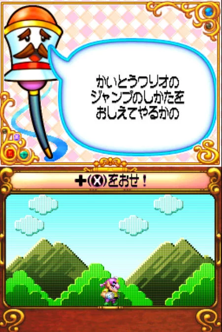 本作是一款2D横版动作游戏,游戏的舞台遍布豪华客船、巨大博物馆、古代遗迹等等,玩家需要操作守十字键控制瓦里奥的前进、后退、跳跃和下蹲,而触控笔的作用则是通过画出不同的图案让瓦里奥变身。