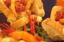 4、烤好的面包取出放上四五汁虾,尾部冲外;