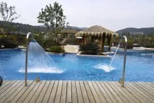 水温45-65℃左右,酸碱值约为pH7,属于弱碱性的碳酸泉。