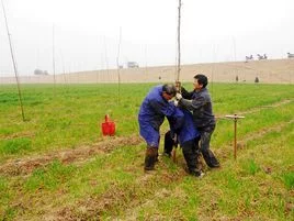 ⑤栽植。包括栽植、填土、提苗、踩实等作业。栽植后及时浇水,有的还设荫棚、搭架或风障,保证成活。