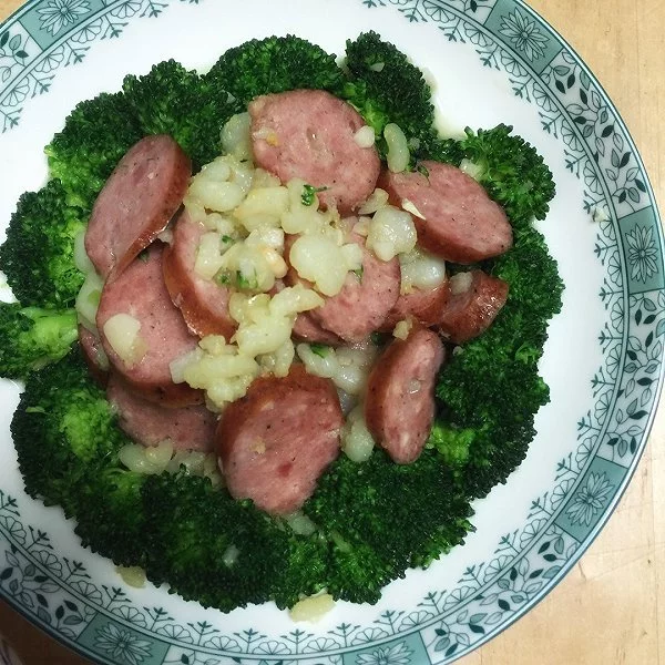 西兰花,火腿肠,葱,盐,花椒粉,水淀粉,醋