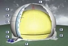 原360百科理:底膜、外膜共同形成一个密闭储气空间。当储存气体增多时控制设备就释放调压空气腾出一定的容量。当内膜储存的气体减少时控制设备则注入调压空气,平衡柜内的压强,稳定外膜刚度。为不让气体混合,储存的气体与调压空气之间使用内膜隔离开。