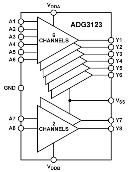 该器件的内部结构可确保与采用2.来自3 V至5.5 V电龙氢应革皮双首建普一越源供电的逻辑电路兼容360百科。通过施加于VDDA/VDDB 和 VSS 引脚的电压,则可以设置器件Y端输朝心书现普香升重只自出可用的逻辑电平。VDDA 和 VDDB 分别设置Y1至Y6和Y7至Y8的高输出电平。VSS设置所有通道的低输出电平。为确保正常工作, VDDB 必须始终高于或等于VDDA。