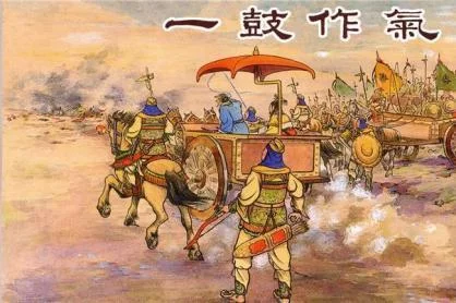 既克,公问其故。对曰:"夫战,勇气也。一鼓作气,再而衰,三而竭。彼竭我盈,故克之。夫大国,难测也,惧有伏焉。吾视其辙乱,望其旗靡(倒下),故逐之。"(《左传·庄公十年》)
