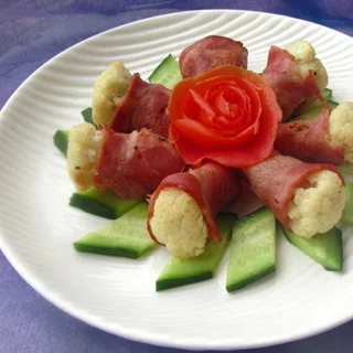 铺层培根片放在下面, 在培根的一端放个花菜和两片蒜片
