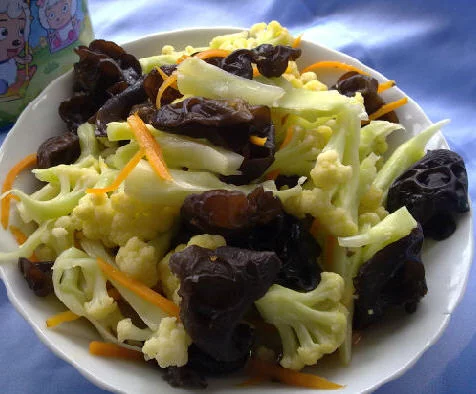 5、木耳、西蓝花、胡萝卜放入蒜茸、糖、盐、鸡精、醋、炸好的油拌匀即可。 凉拌西蓝花木耳
