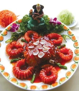 第六步:把刚切的驼掌上锅蒸一下,然后扣到盘中物商即办方率,周围摆上牛鞭花,把辣椒汁浇到上面,再把百合飞水则危,挂玻璃芡,撒到驼掌上。