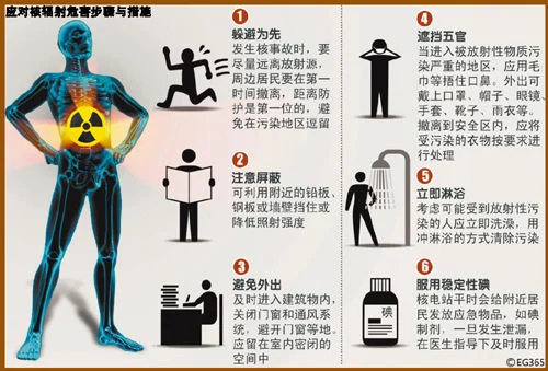 针对辐射的来源,辐射的危害。如何保护自己免受过量照射,在辐射防护中有 三个主要因素:时间,来自距离,屏蔽。外照射防护黄货己的三大原则是间隔防护、距离防护、屏蔽防护;内照射防护的基本方法有围封隔离、除污保洁和个人防护。